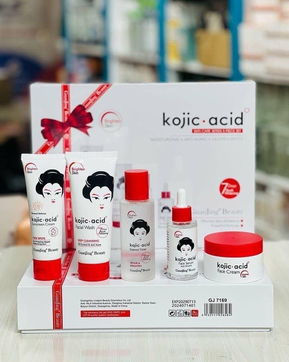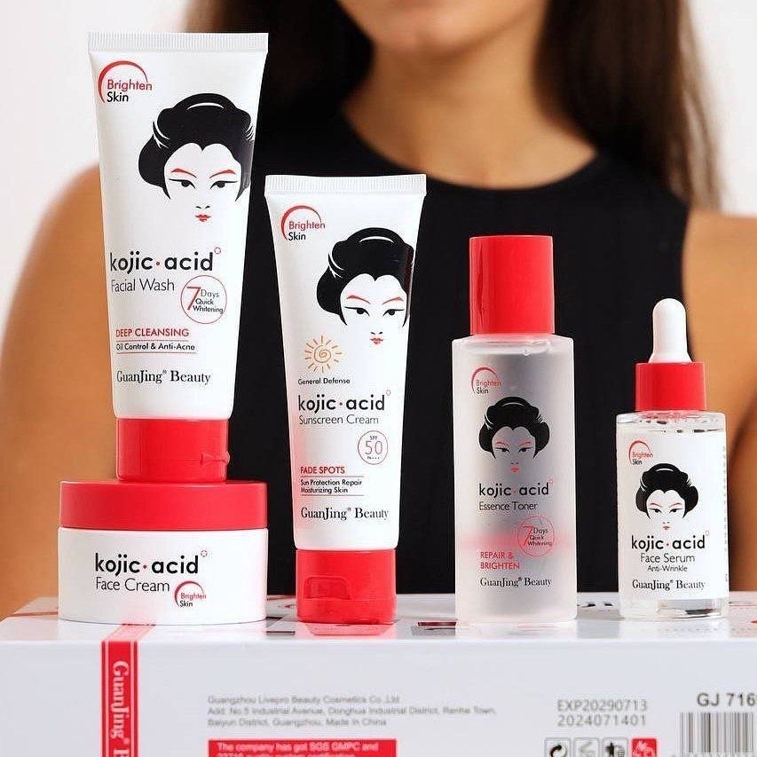مجموعة العناية بالبشرة من كوجي سان GuanJing Beauty Kojic Acid، وهي سلسلة منتجات مصممة خصيصاً لتفتيح البشرة، و مكافحة الشيخوخة، وعلاج التصبغات والبقع الداكنة. تعتمد هذه المجموعة على حمض الكوجيك (Kojic Acid) الذي يعمل على تثبيط إنتاج الميلانين، مما يساعد في توحيد لون البشرة وتقليل آثار حب الشباب والبقع الناتجة عن الشمس.