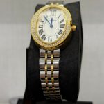 Inspired by the iconic Cartier Baignoire silhouette, this exquisite timepiece features a distinctive oval case framed by a stunning double-row diamond bezel. The crisp white dial showcases bold black Roman numerals with elegant blue sword-shaped hands, a signature of Cartier’s refined craftsmanship. The two-tone bracelet seamlessly blends polished silver and gold, making it a versatile piece for any occasion.