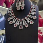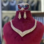 Elegant 3-piece zircon bridal set featuring a floral leaf necklace, drop earrings and matching ring with soft lavender and white stones.